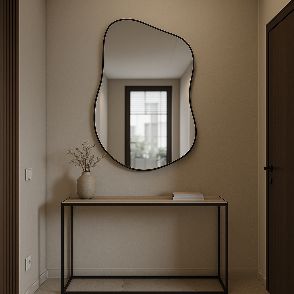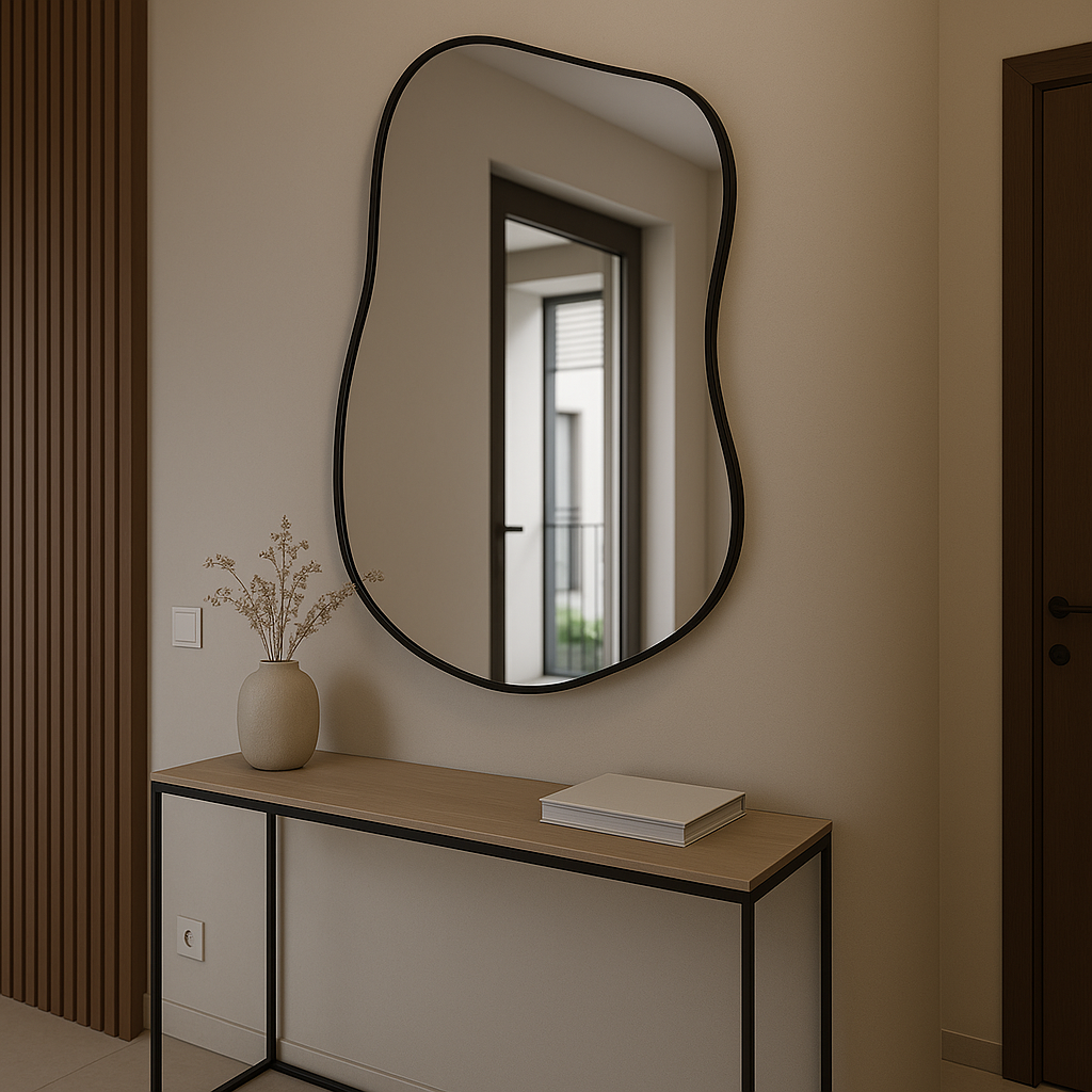 Czarna rama zamyka taflę szkła w wyrazistej kompozycji, tworząc mocny, graficzny akcent.