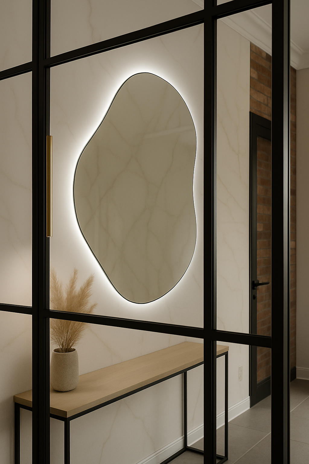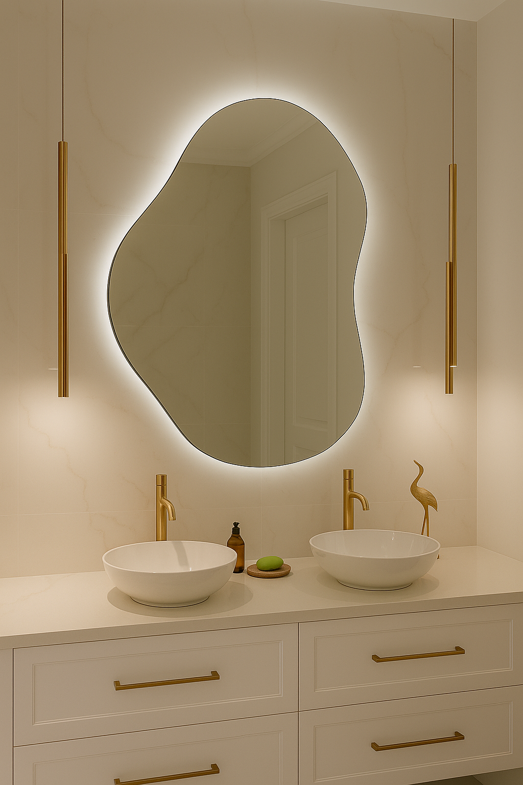 Sereno to lustro, które emanuje spokojem już samą formą. Jego linia jest bardziej wyciszona, subtelna i uporządkowana — jak organiczna bryła „wygładzona” przez naturę. Kształt nie stara się zaskakiwać, tylko uspokaja kompozycję wnętrza, dodając jej elegancji i oddechu. Podświetlenie LED tworzy wokół tafli delikatne halo, które nadaje lustru lekkości i sprawia, że wygląda jak miękko podświetlony obiekt, a nie zwykły element ściany.