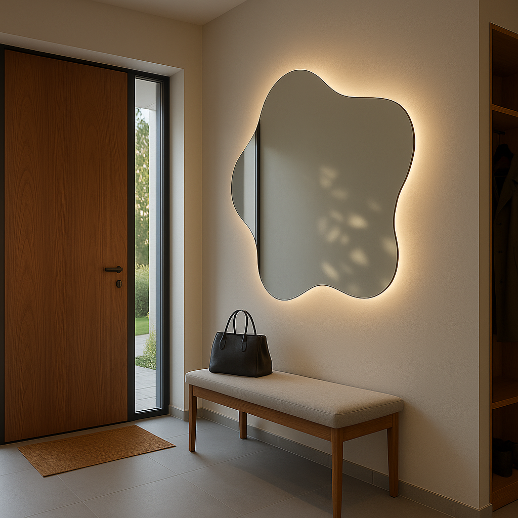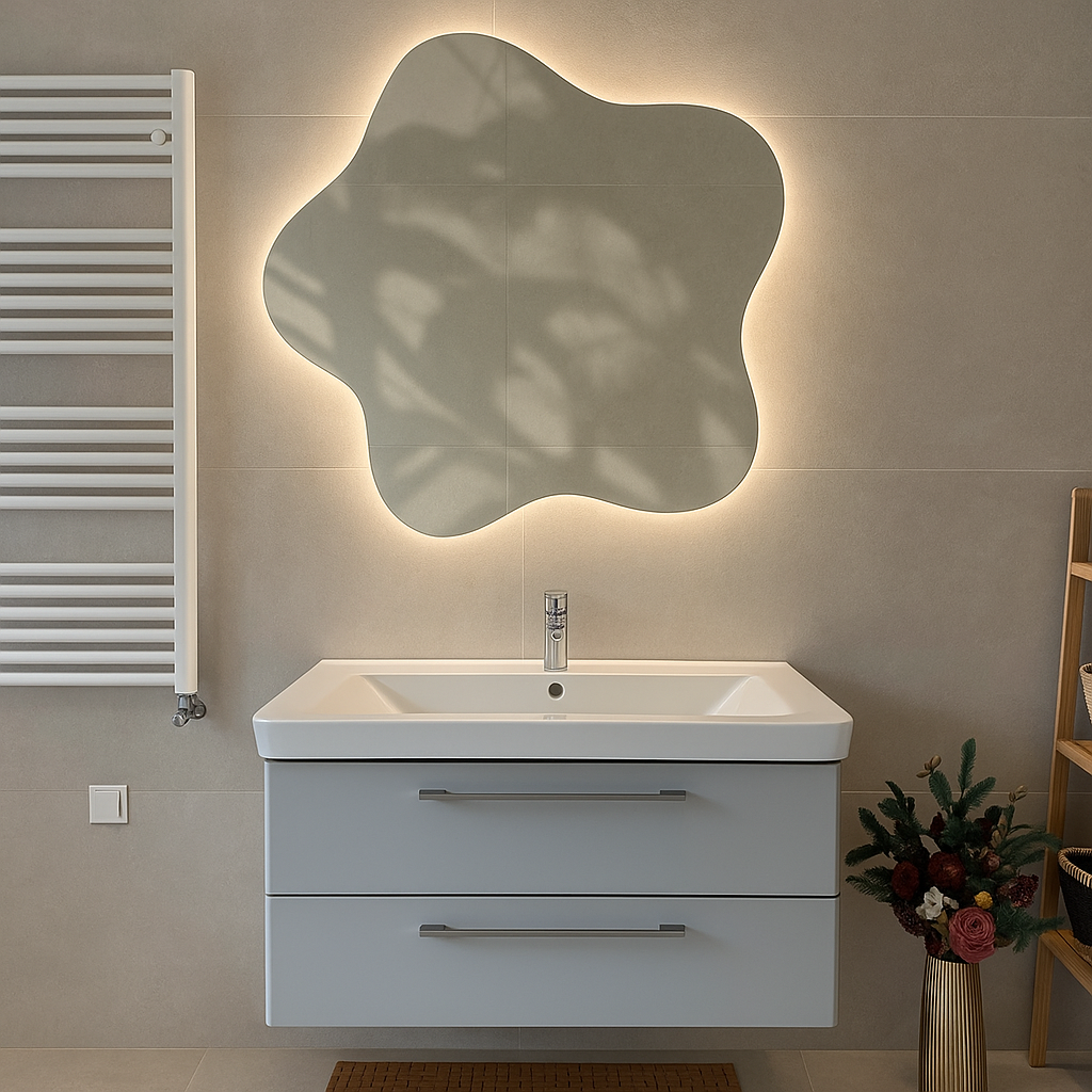 Bruma to lustro o bardziej panoramicznej, szerokiej sylwetce — jak horyzont w świetle księżyca, zamglony i miękki. Forma jest organiczna, ale wyważona: kontur jest spokojny i płynny, dzięki czemu lustro wygląda bardzo elegancko i lekko. LED podkreśla jego linię, tworząc wrażenie delikatnej mgiełki wokół tafli — stąd nazwa Bruma. To model, który subtelnie poszerza przestrzeń i dodaje jej architektonicznego „oddechu”.