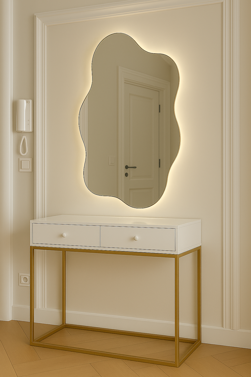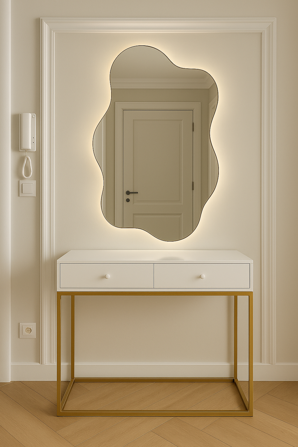 Idealnie przejrzysta tafla szkła o srebrnym połysku, otoczona świetlną ramą w odcieniu złamanej bieli. Ciepły ton światła podkreśla miękkość formy, tworząc harmonijny dialog z każdym wnętrzem..
