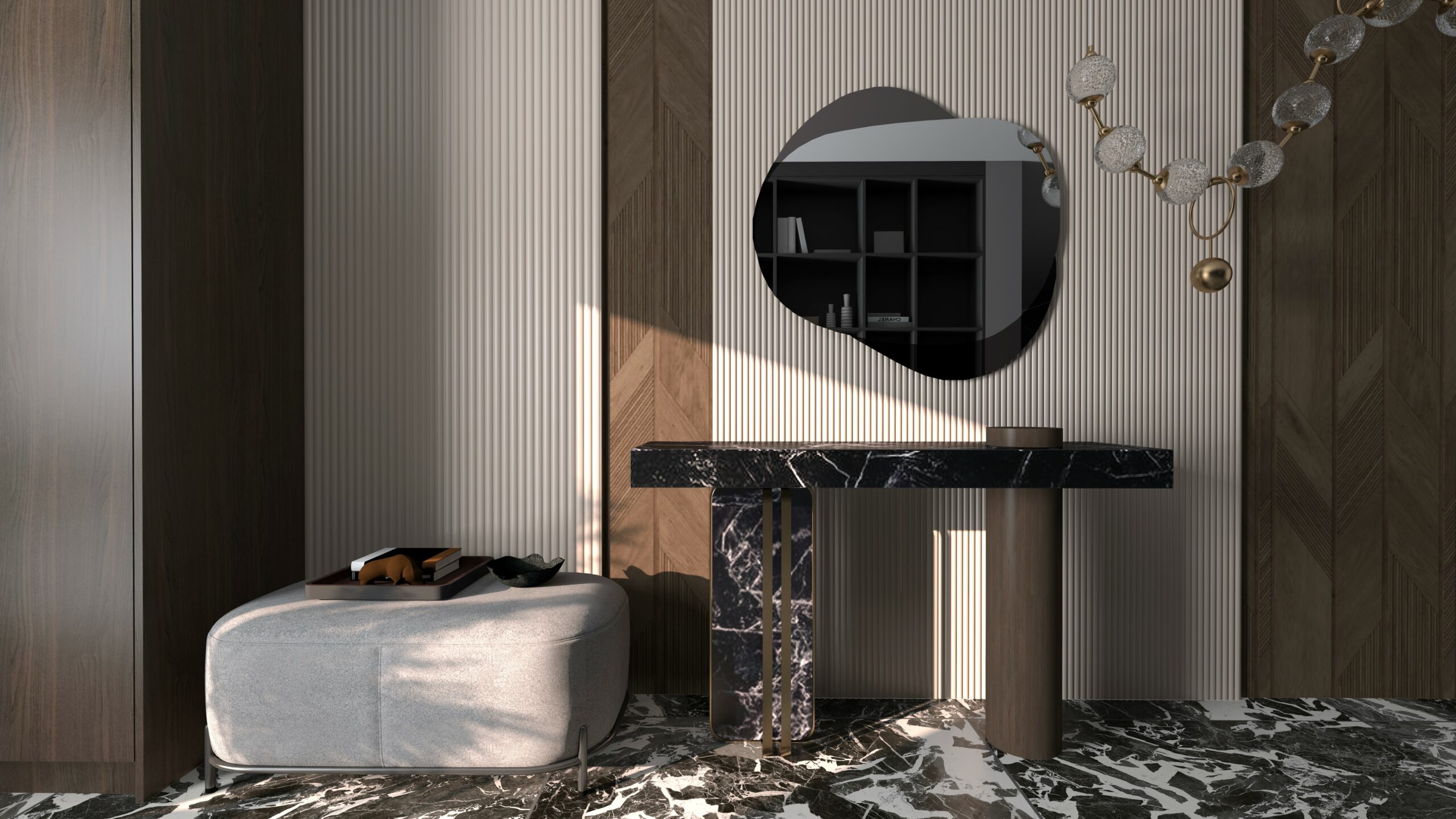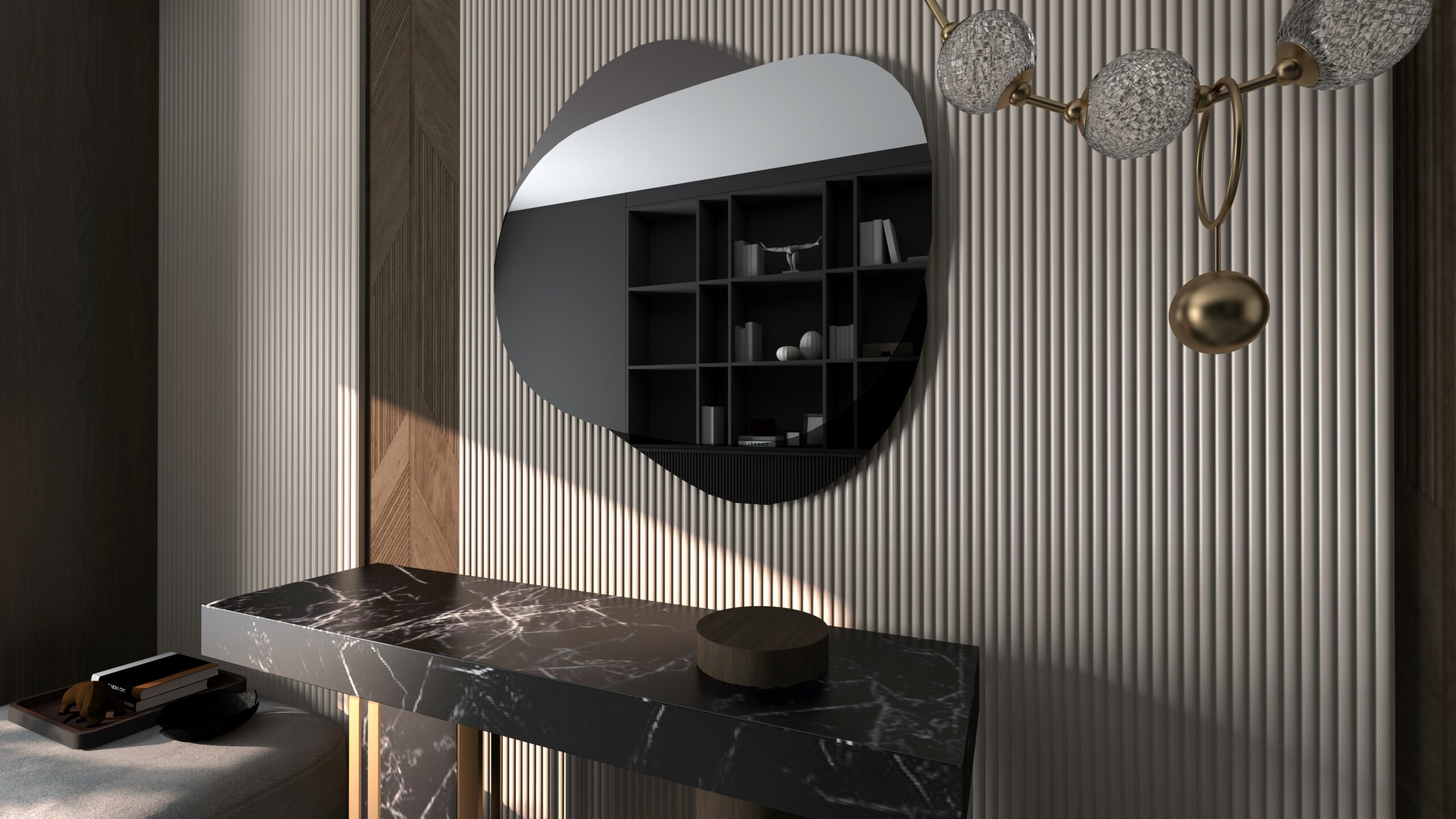 Lustro Nucleo Ombra odnajduje się świetnie w aranżacjach nowoczesnych, minimalistycznych, industrialnych, a także tych z nutą art déco. To wybór dla osób ceniących wyrafinowaną prostotę z twistem.