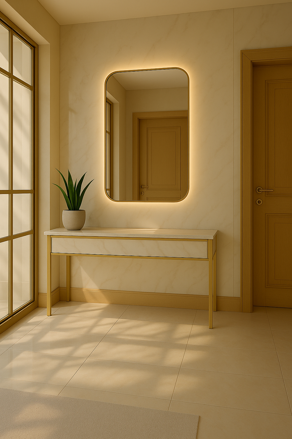 Srebrna tafla o perfekcyjnej przejrzystości, rozświetlona naturalnym, złocistym światłem LED. Efekt świetlnej ramy nadaje wnętrzu głębi i poczucia spokoju.