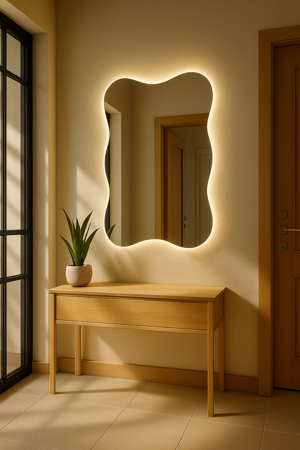Tafla w odcieniu czystego srebra, idealnie odbijająca światło dzienne. Ciepła poświata LED tworzy efekt wizualnej miękkości i głębi.